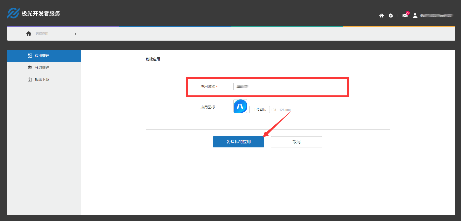 1. 输入APP名称(这里的APP名称和封装时的APP名称可以不一致),APP图标可以不填写,填写完成后,点击【创建我的应用】